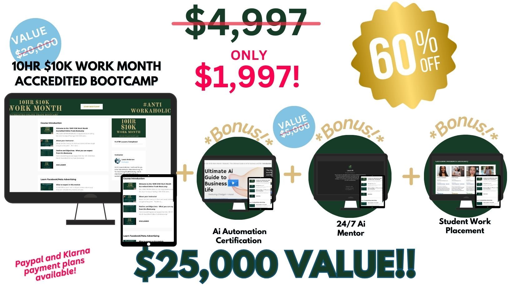 Students receive professional certifications recognized in 51 countries in Meta Advertising, Tik Tok Advertising, Email Marketing, and Ai Automation. Most trainings charge more for just one trade and without a certification. This Bootcamp is designed to not only certify you but teach you everything you need to run a profitable business essentially on autopilot. You also get lifetime access along with all the updates so you're always ahead of the curve, something no degree will ever give you. Fully accredited, it's valued at over $20,000 with an insane amount of tactical knowledge. If you're willing to make a change and take action, it's definitely worth it!