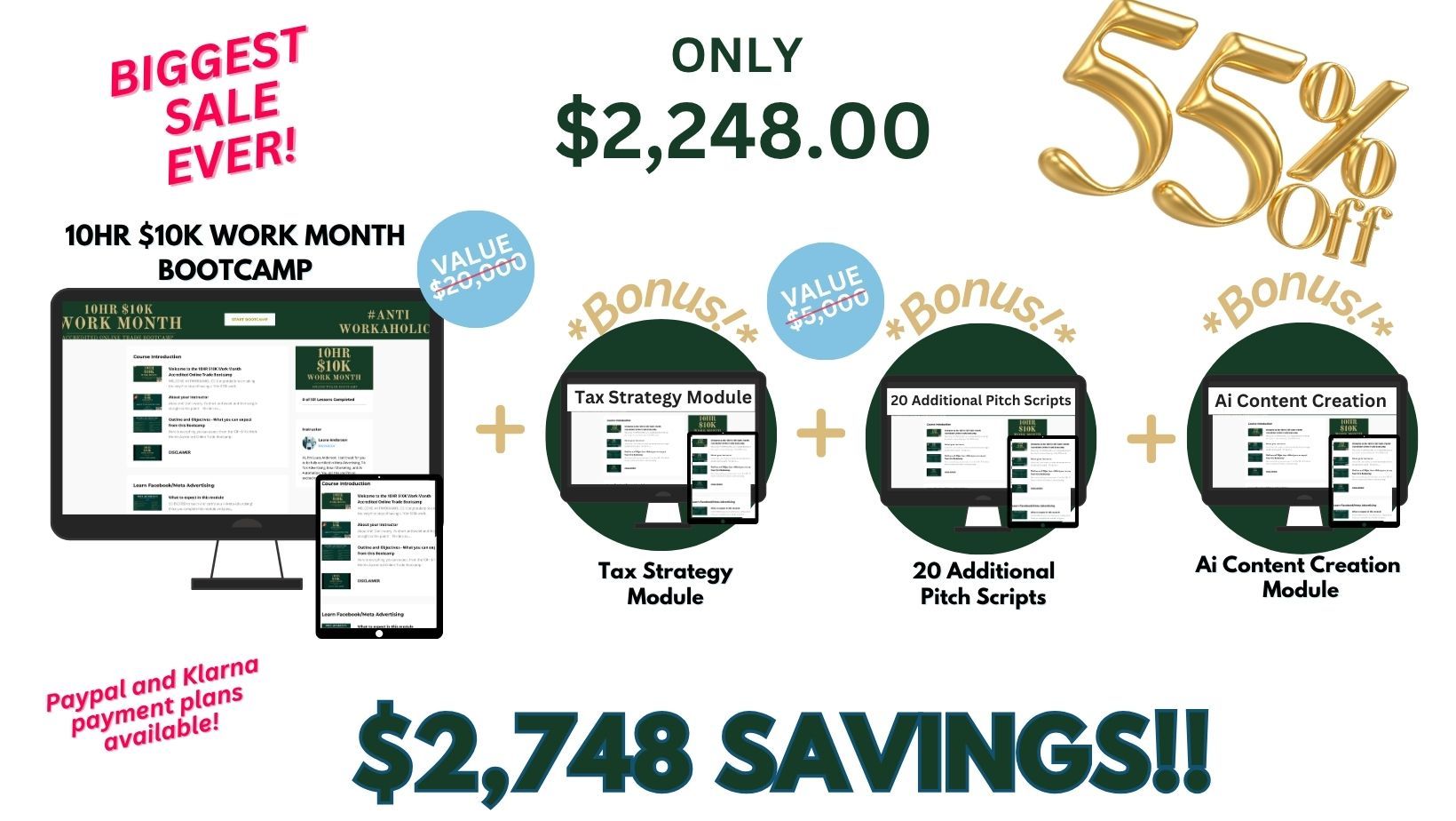 - The full 10hr $10k work month Bootcamp: Where you learn to work smarter not harder. Learn 3 super high-in demand high-paying digital trades (Meta ads, Tik Tok ads, AND Email Marketing). Learn to book clients and actually make $$$. Learn how to automate and streamline with Ai automations, learn how to delegate and outsource like a pro, and receive all the done for you templates to make it happen! (No one teaches the business side, I'm here to change that!) Plus these 3 INSANE exclusive modules (valued at $5k)